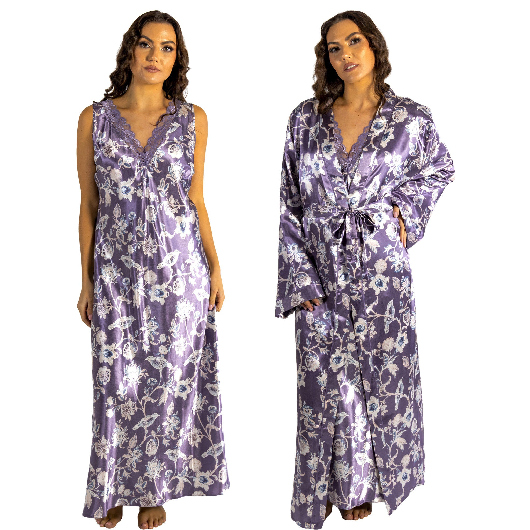 Matching Lilac Purple Floral Sexy Satin Long Nightdress & Wrap Set Negligee Lingerie PLUS SIZE