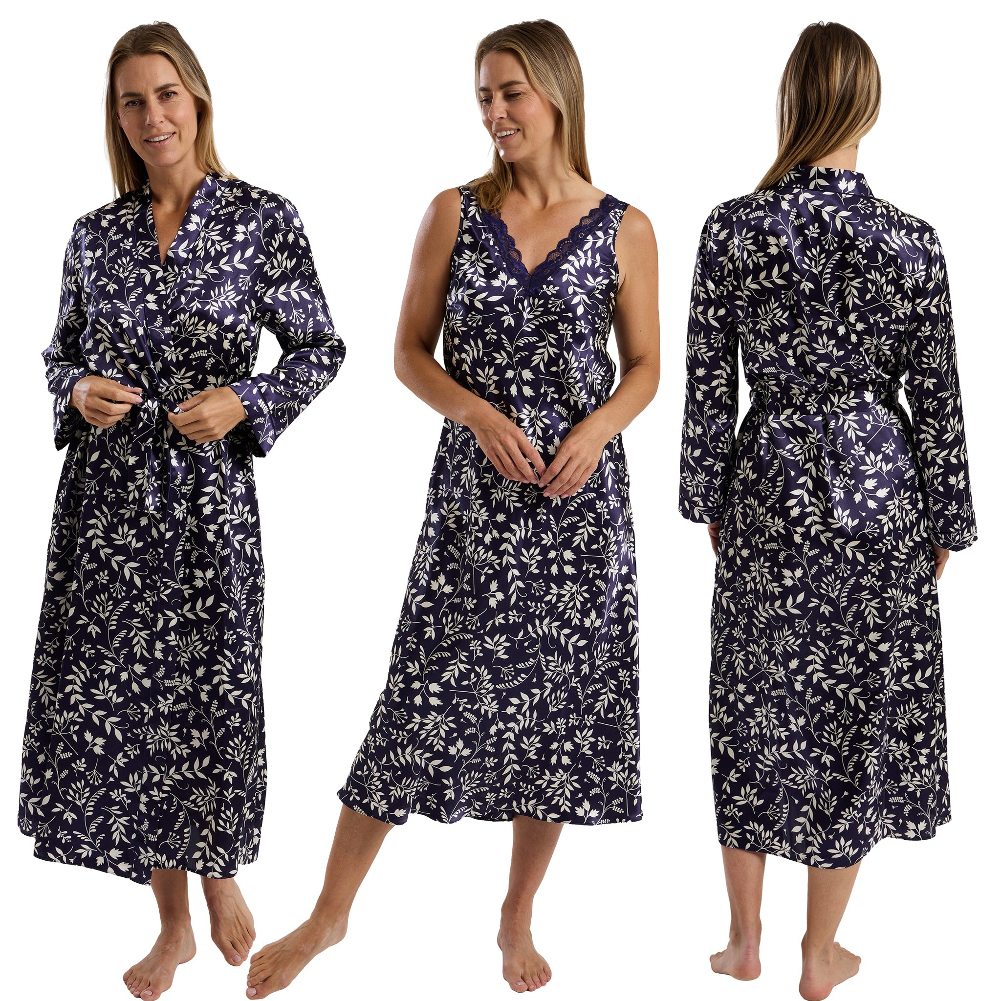 Matching Indigo Blue Floral Sexy Satin Long Nightdress & Wrap Set Negligee Lingerie