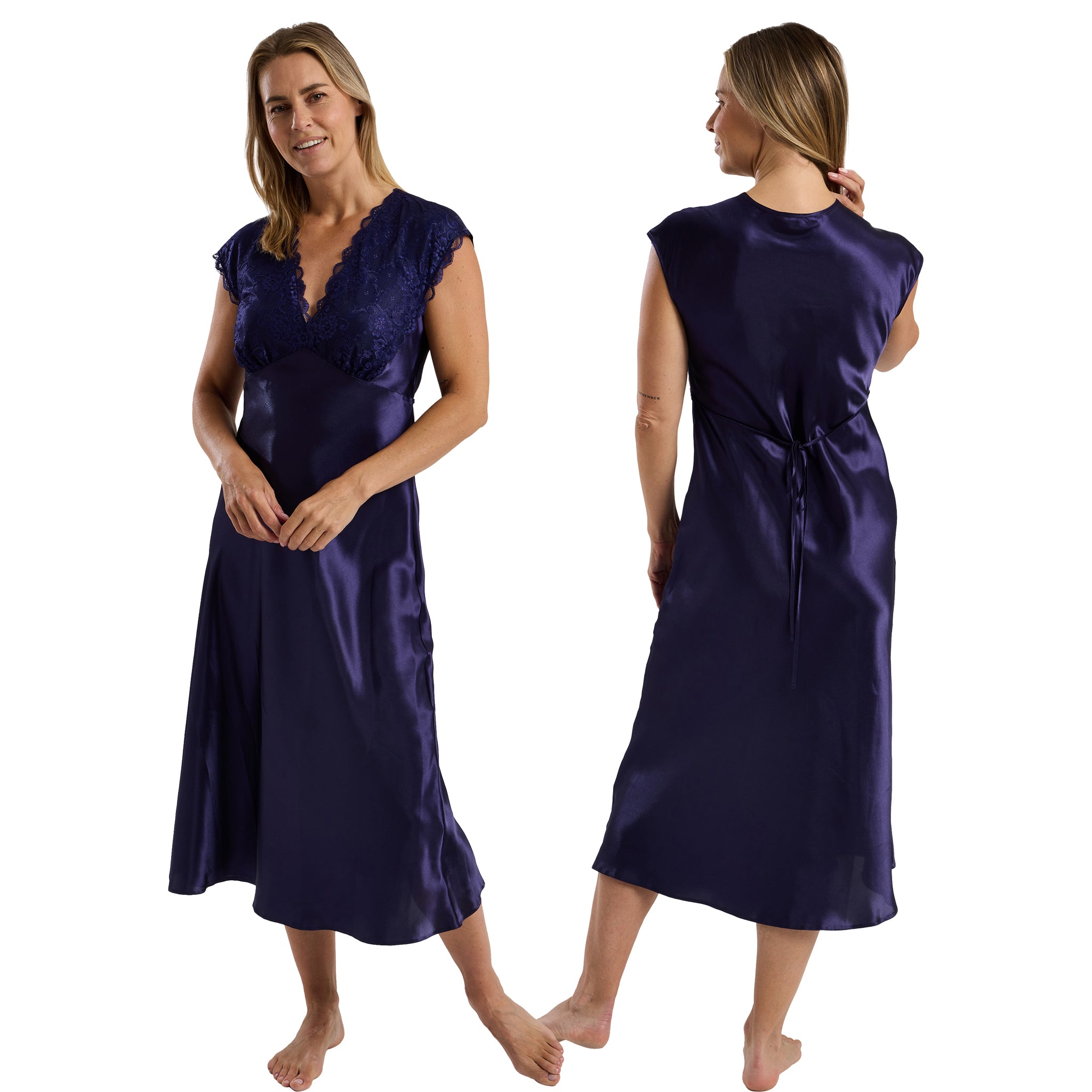 Plain navy blue wide strap full length long sexy satin nightdress negligee. Delicate shiny silky satin and floral lace trim long full length nightie with wider fixed straps with a vee neck lace detail.