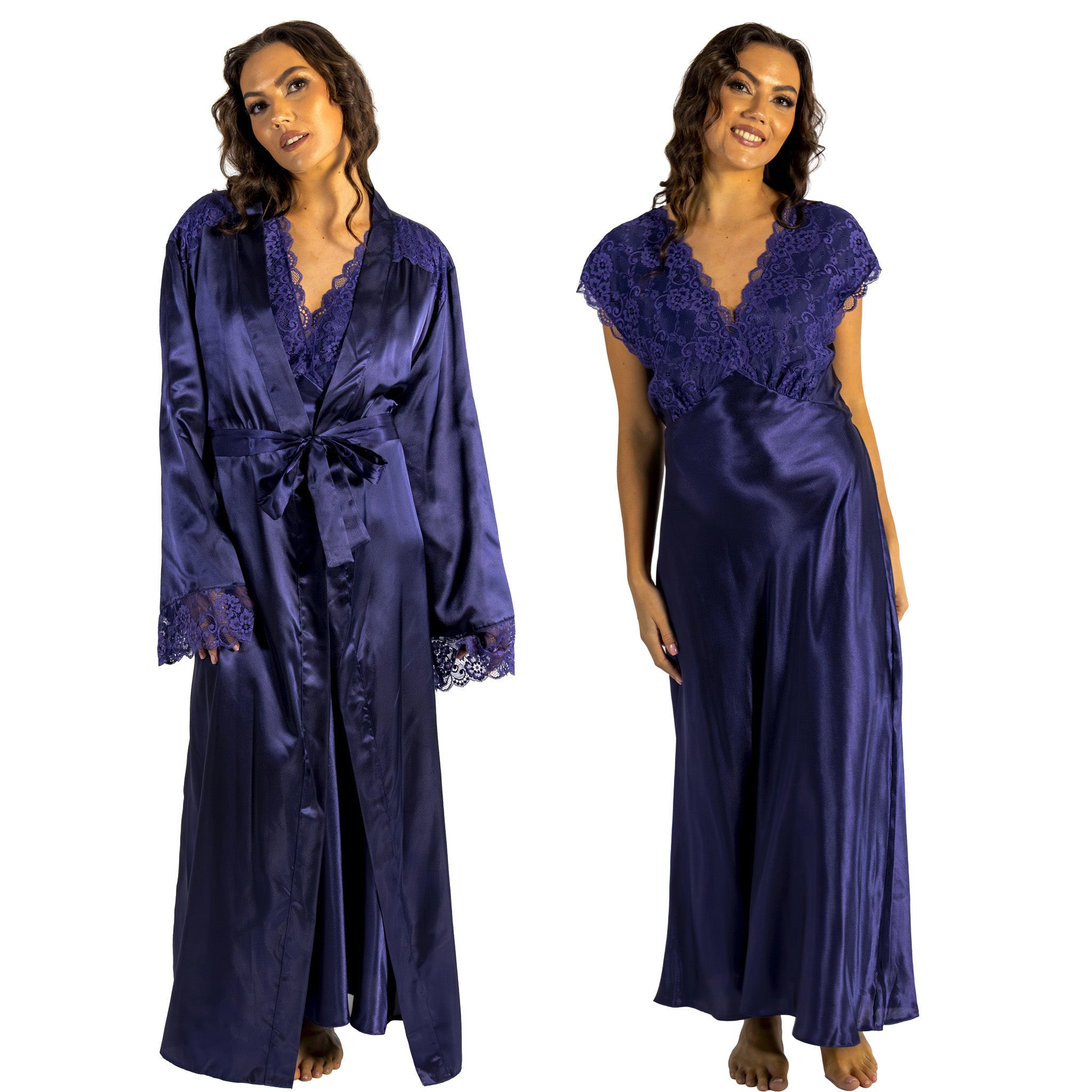 Matching Indigo Navy Blue Sexy Satin Long Nightdress & Wrap Set Negligee