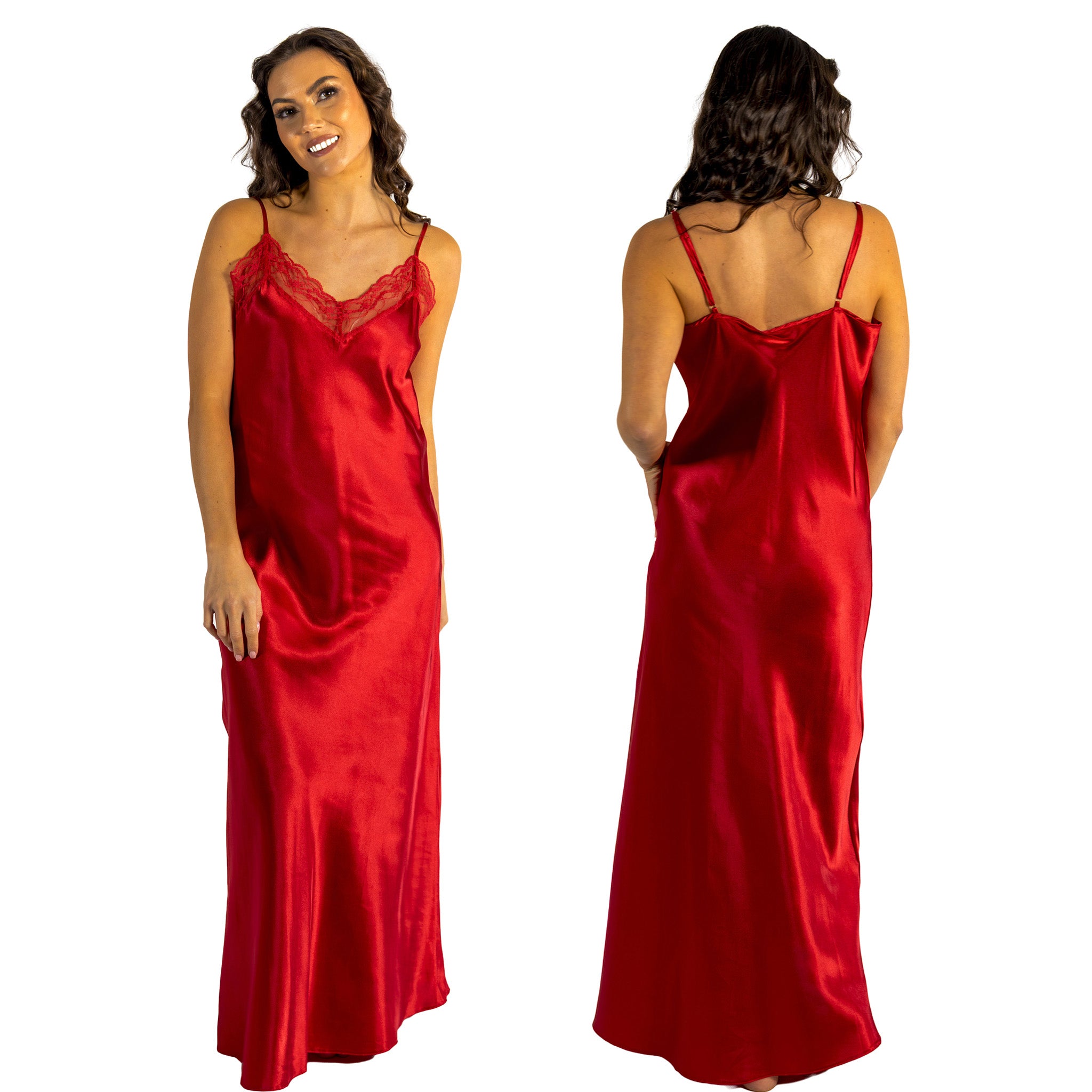Long full length red sexy silky satin lace nightdress, chemise negligee PLUS SIZE. Delicate red shiny satin and floral lace trim long full length full slip nightie with adjustable straps with a vee neck lace detail.