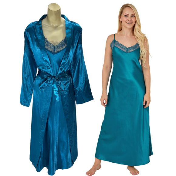 Matching Indigo Navy Blue Sexy Satin Long Nightdress & Wrap Set Negligee