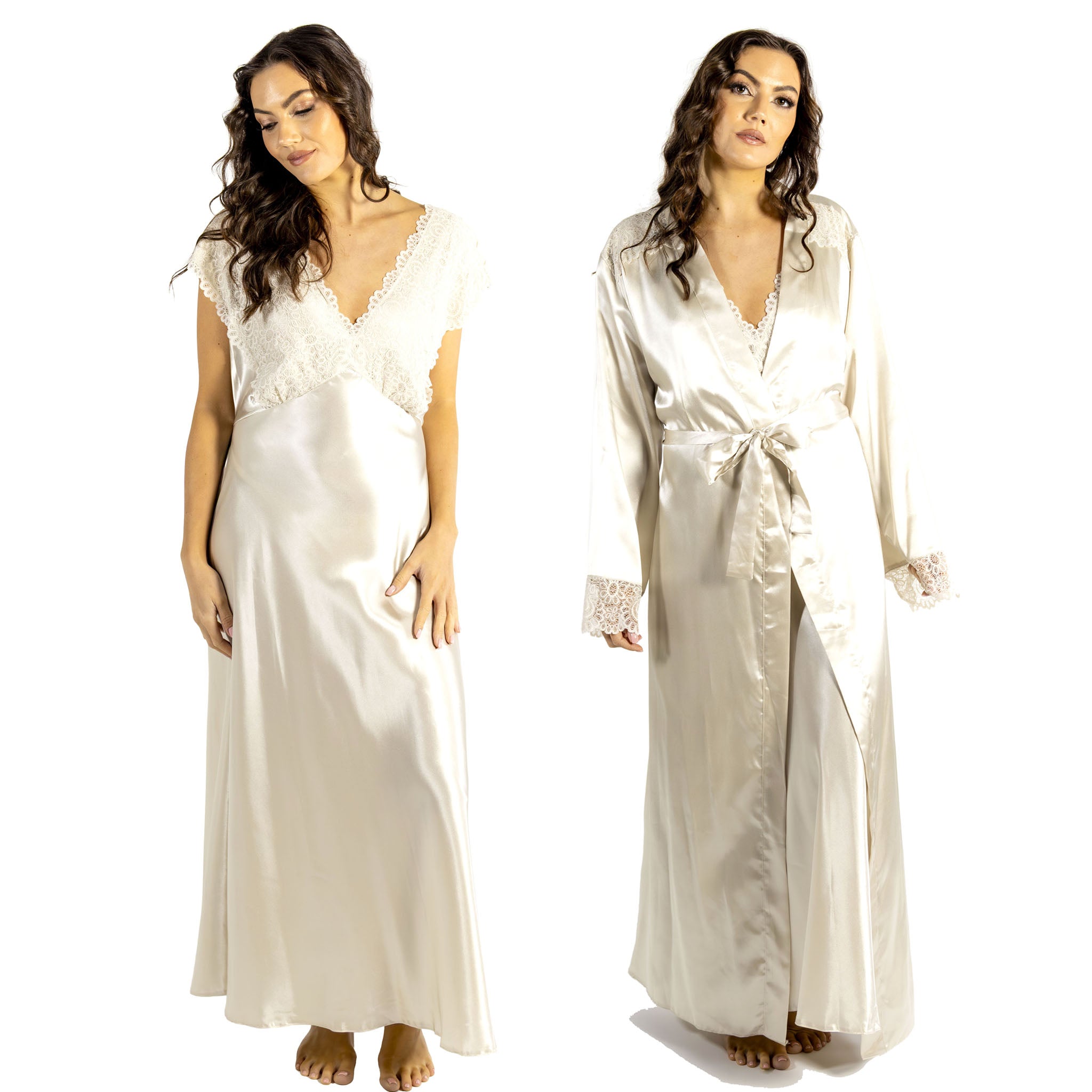 Matching gold beige sexy satin long nightdress & wrap set negligee PLUS SIZE. Delicate shiny silky sexy satin and lace long full length chemise nightdress and wrap, dressing gown, bathrobe as a set with wide fixed straps.