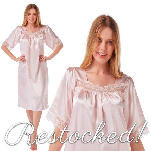 Pastel Pink Sexy Shiny Silky Satin Lace Short Sleeve Nightdress Nightie PLUS SIZE