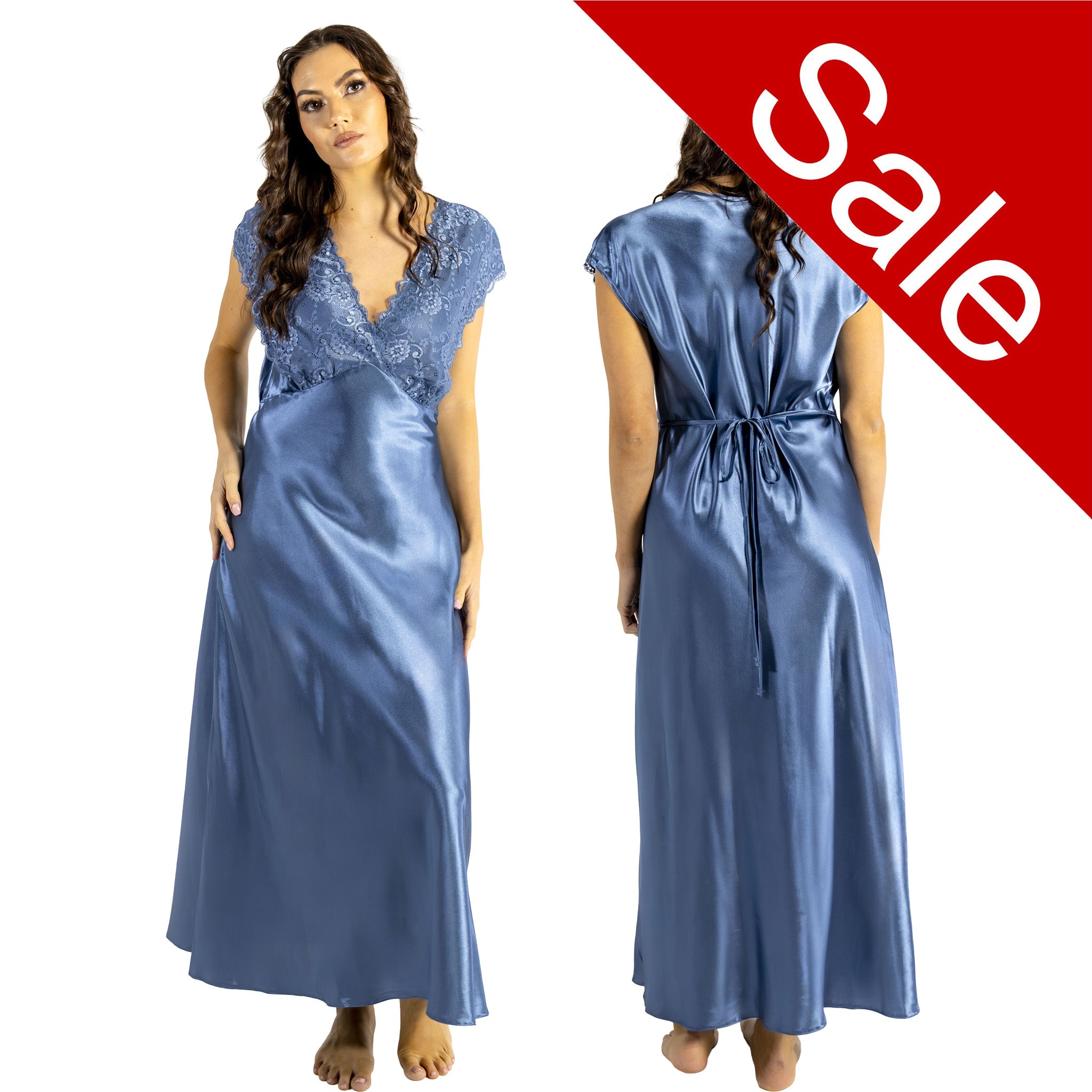 Delicate shiny silky satin and lace long full length nightdresses with wider fixed straps. With a vee neck lace detail.