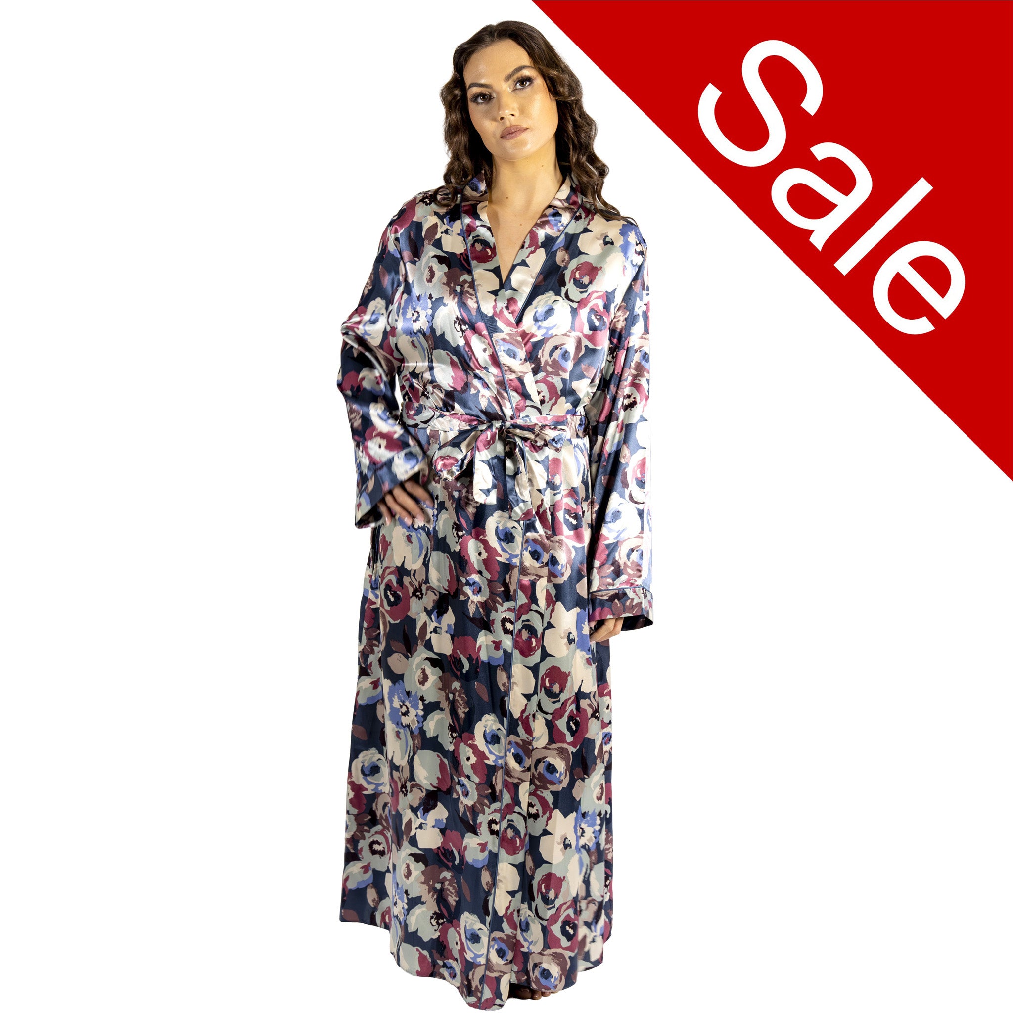 Delicate blue abstract floral shiny silky sexy satin wrap, dressing gown, kimono, bathrobe which are long full length and finish around the ankle depending on your height. The wrap is long sleeved with satin ties inside and outside to keep it in place. They have internal pockets.