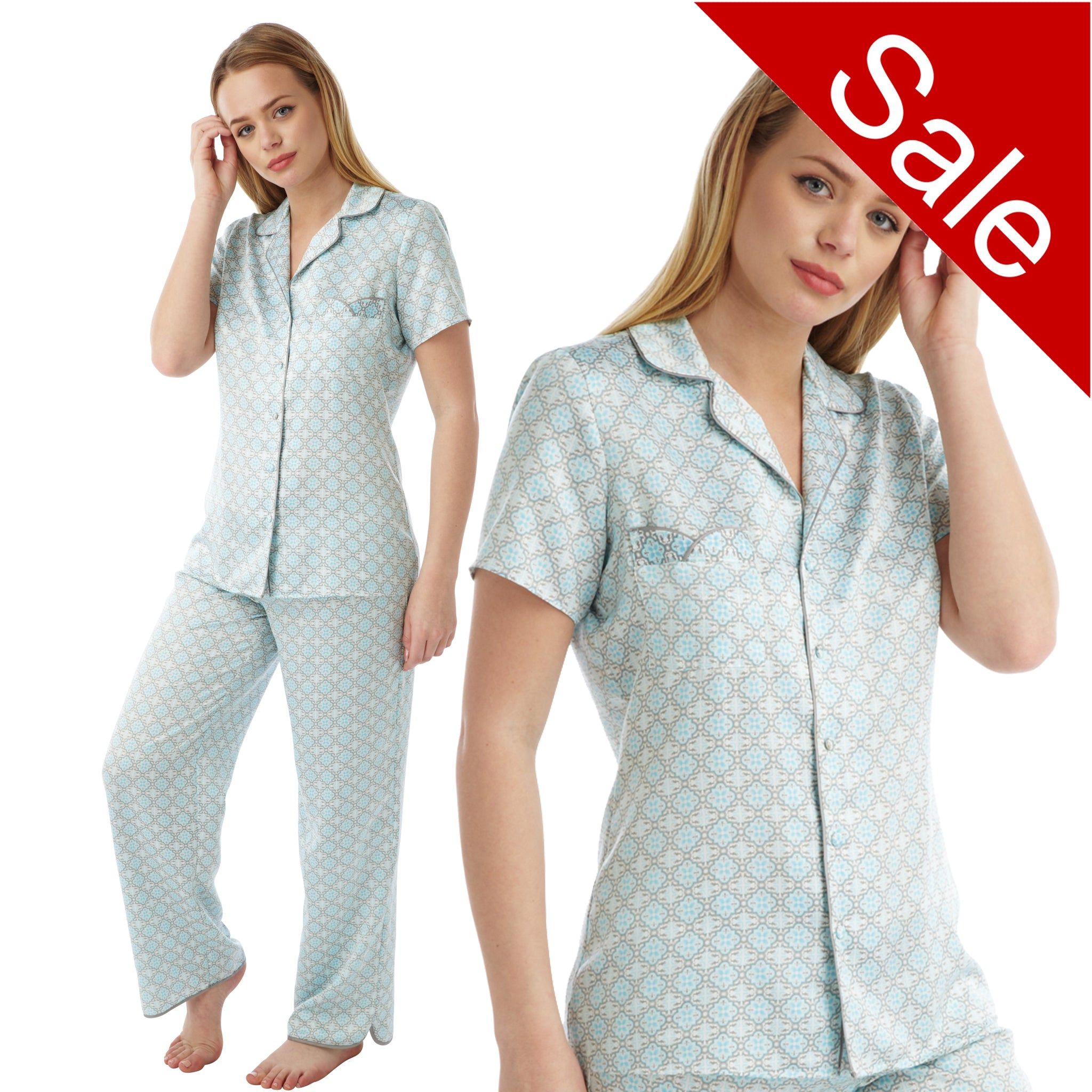 Delicate mat satin pyjamas, pjs, pajamas set. The tops have short sleeves with buttons and pocket. The trousers are full length with an elasticated waist band. They have satin covered buttons.