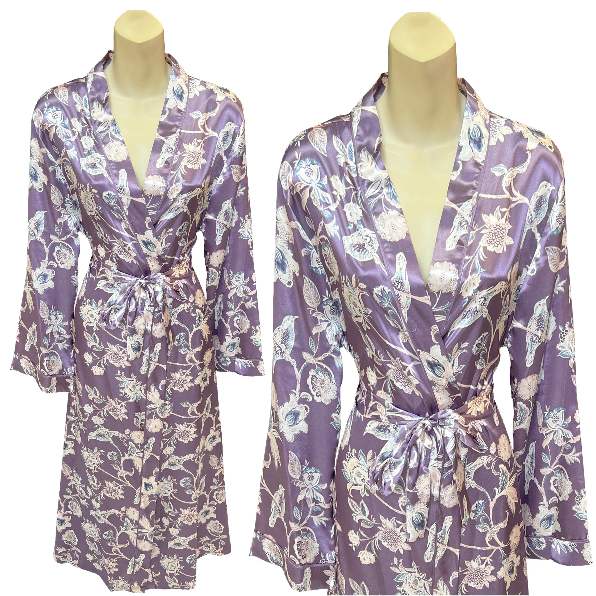 Long Full Length Floral Lilac Purple Sexy Silky Shiny Satin Wrap Bathrobe PLUS SIZE