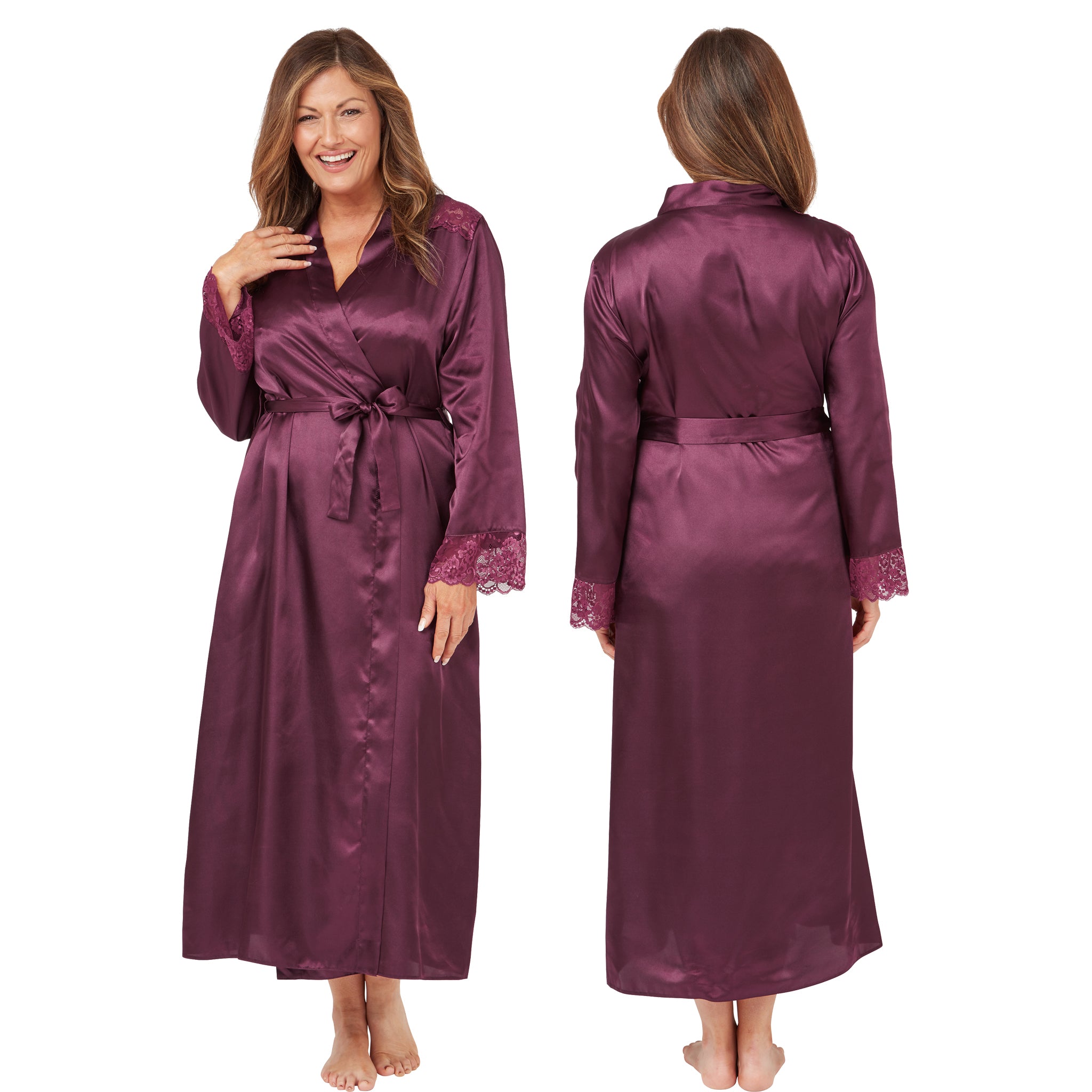 Long Full Length Mulberry Purple Sexy Satin Lace Wrap Bathrobe
