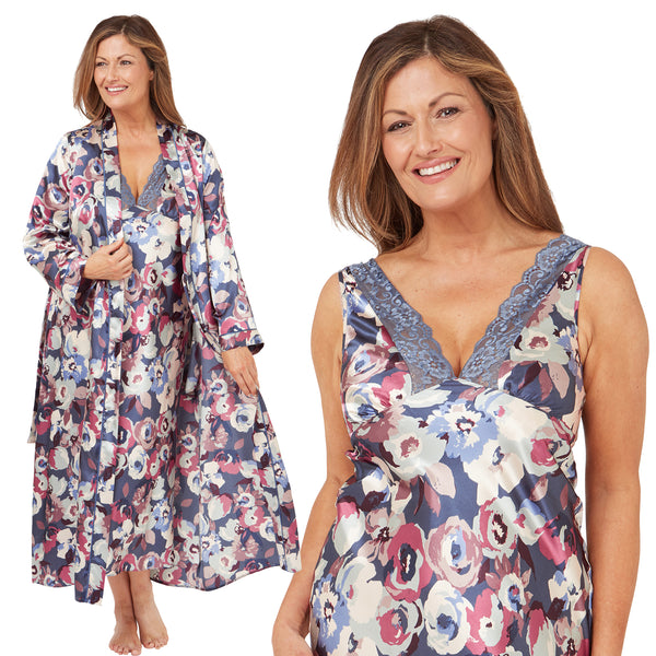 Matching Blue Abstract Floral Sexy Satin Long Nightdress & Wrap Set Negligee Lingerie PLUS SIZE